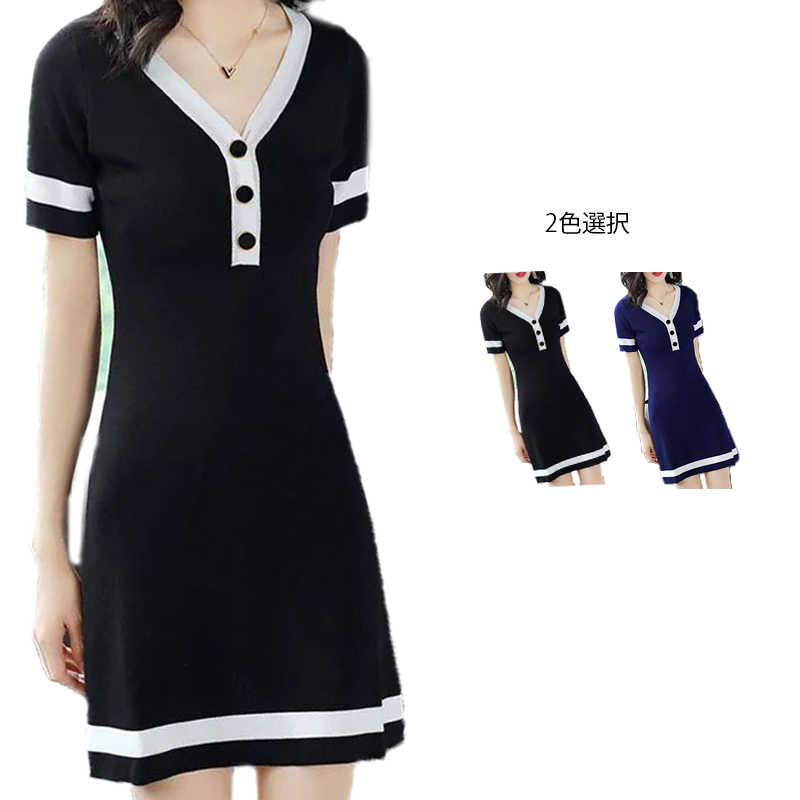 おしゃれワンピース Vネック 半袖 ニット ミディアム丈 ワンピース 学生服 無地 シンプル カジュアル おしゃれ ライン