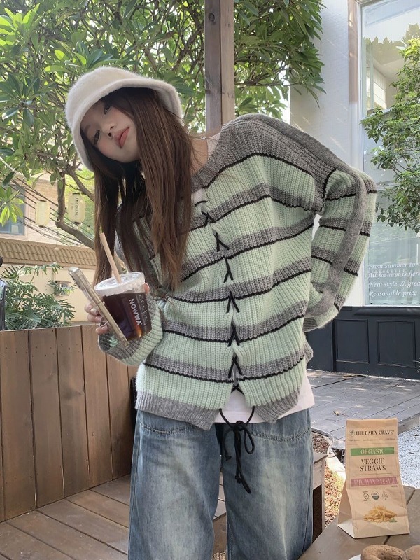 ニット セーター 長袖 ショート丈 バイカラー 配色 体型カバー カットソー ボーダー柄 ストライプ柄 ライン ヴィンテージ風 レトロ調 sweet系 原宿系ファッション 韓国風ダンス 衣装 ヒップホ