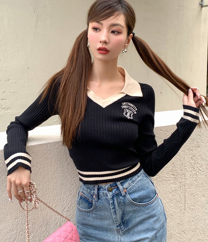 ニット セーター ショート丈 長袖 ネック バイカラー 配色 カットソー 系 原宿系ファッション 韓国風ダンス 衣装 ヒップホップ 個性 奇抜 かわいい 青文字系 トップス