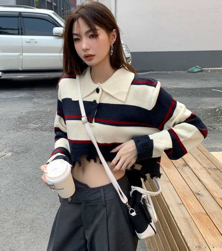ニット セーター 長袖 ショート丈 バイカラー 配色 体型カバー カットソー ボーダー柄 ストライプ柄 ライン ヴィンテージ風 レトロ調 系 原宿系ファッション 韓国風ダンス 衣装 ヒップホ