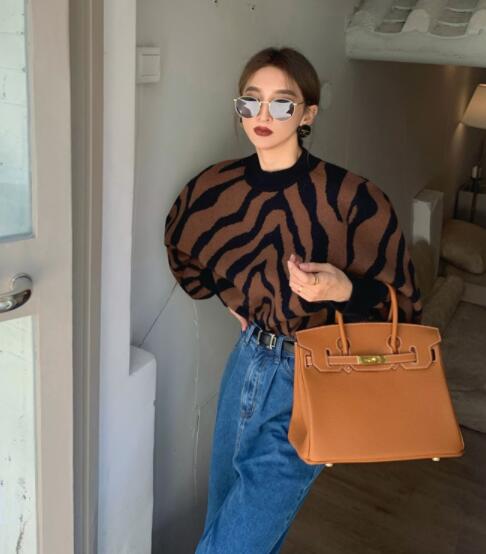 カットソーニットセータートップスヒョウ柄ゆったりあったか体型カバーガールズストリートシンプル長袖個性的韓国