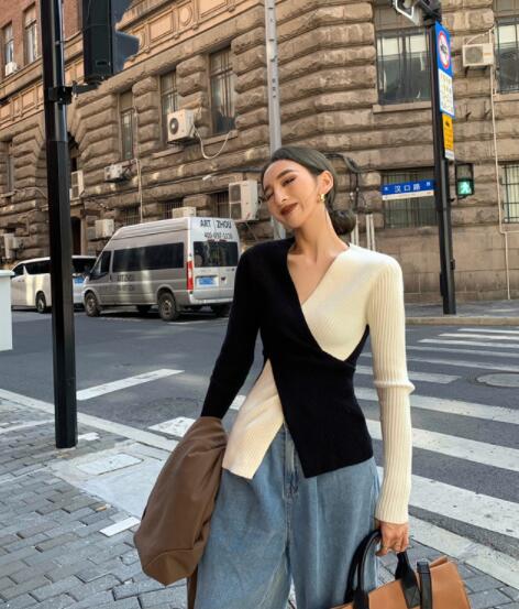 ♪2色展開♪カットソーニットトップス交差するネック着やせ効果スリムガールズストリートシンプル長袖個性的かわいい韓国