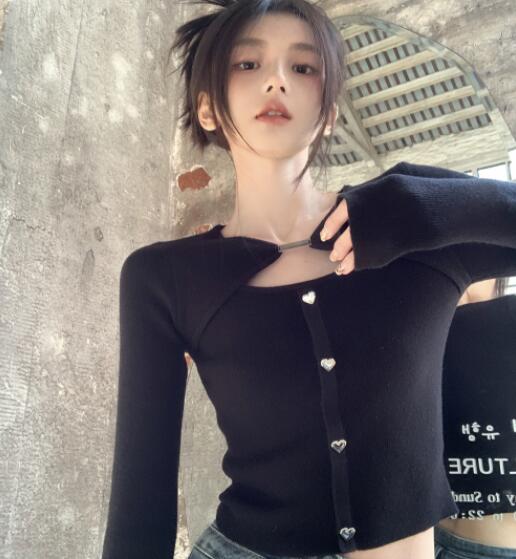 ♪2色展開♪カットソーニットトップス重ね着ハート短い短めスリムガールズストリートシンプル長袖個性的かわいい韓国