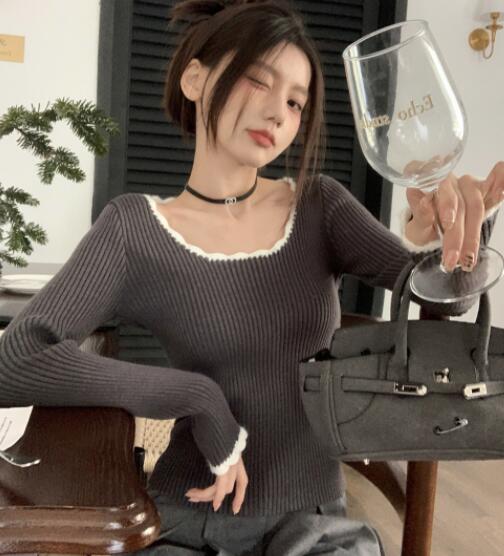 ♪2色展開♪カットソーニットトップス無地スリムガールズストリートシンプル長袖個性的かわいい韓国レディースファッション トップス ニット セーター セーター