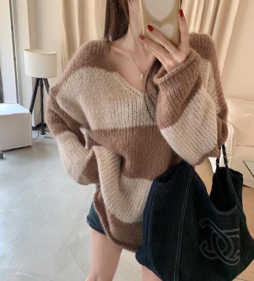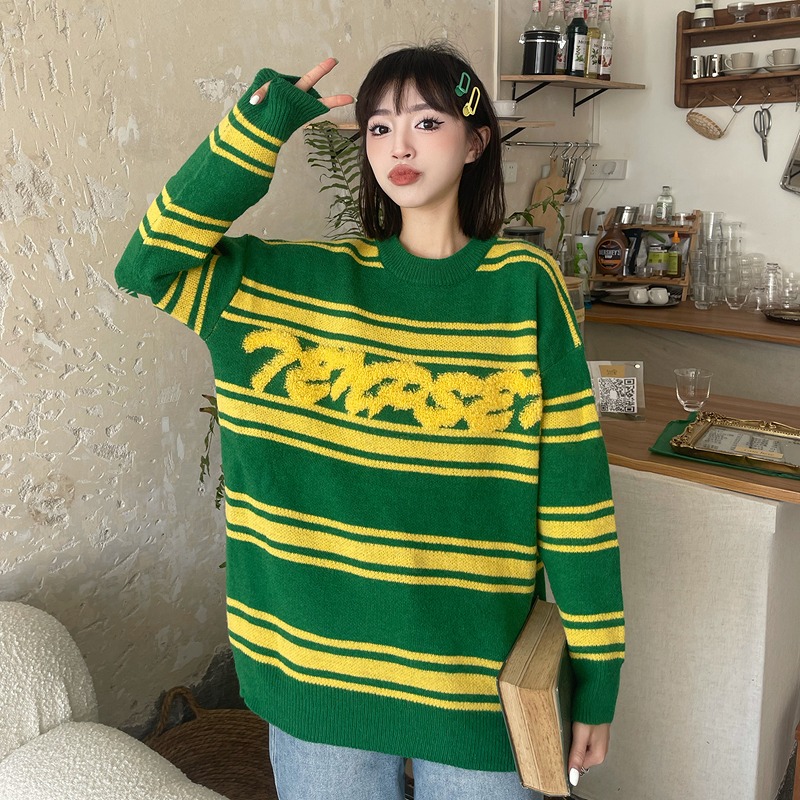 ニット セーター 長袖 バイカラー 配色 体型カバー カットソー ボーダー柄 ストライプ柄 ライン 原宿系ファッション 韓国風 ダンス衣装 カワ 個性 奇抜 かわいい 青文字系 トップス レデ
