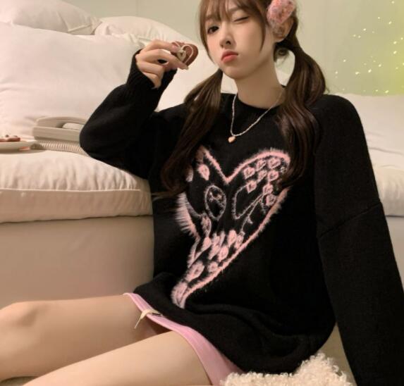 ニットセーター長袖トップスカットソーブラックピンクハートもこもこふんわりふわふわ可愛いヒップホップレディースガールズストリート韓国奇抜派手個性的