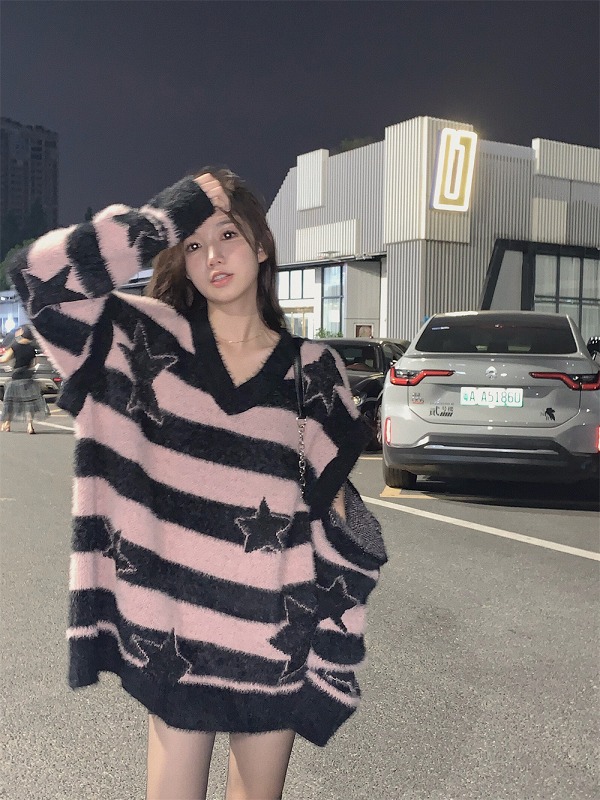 ニット セーター 長袖 バイカラー 配色 体型カバー カットソー ボーダー柄 ストライプ柄 ライン 原宿系ファッション 韓国風 ダンス衣装 POP カワ 個性 奇抜 かわいい 青文字系 トップス レデ
