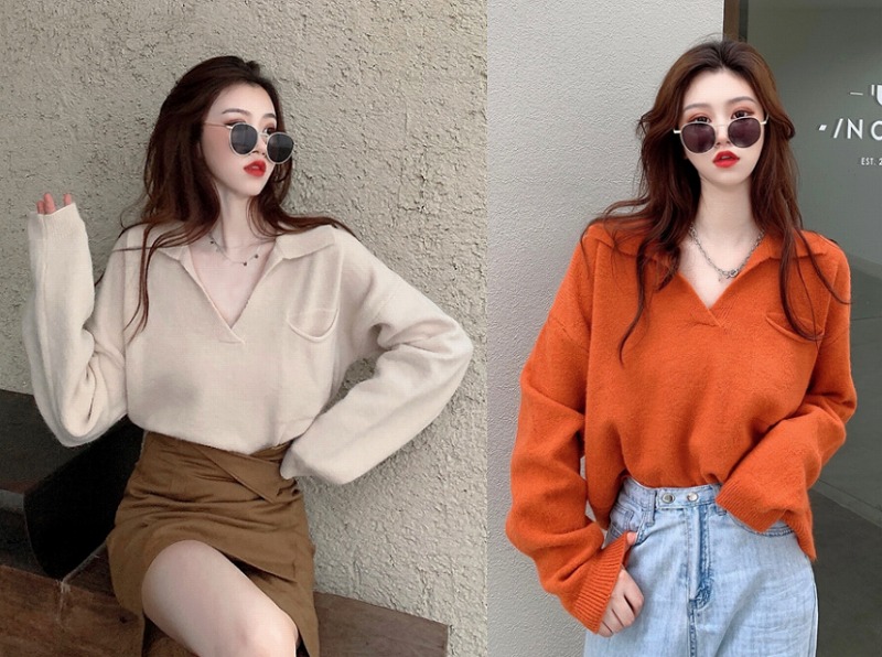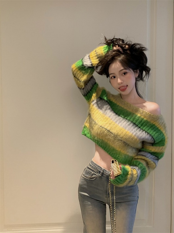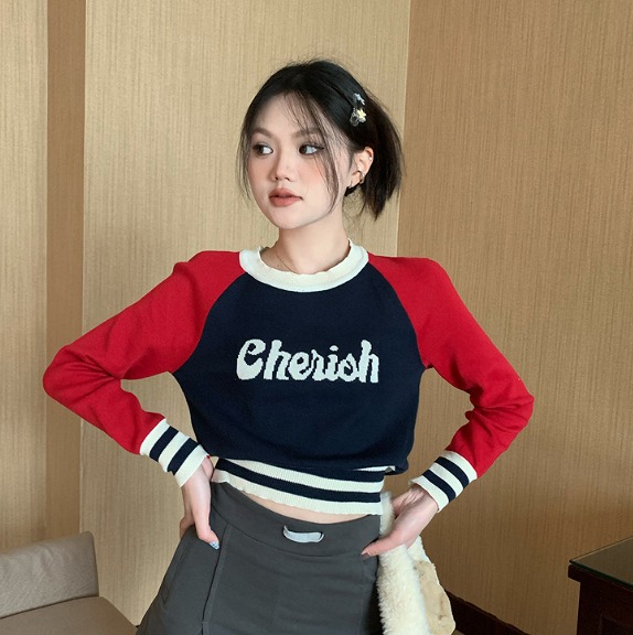 全2色 ニット セーター 長袖 ショート丈 バイカラー 配色 体型カバー カットソー ヴィンテージ風 レトロ調 原宿系ファッション 韓国風ダンス 衣装 ヒップホップ 個性 奇抜 かわいい