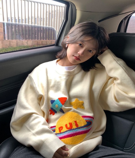 ニット セーター 長袖 体型カバー カットソー LOGO ロゴ 英字 sweet系 原宿系ファッション 韓国風ダンス 衣装 ヒップホップ HIPHOP 個性 奇抜 かわいい 青文字系 トップス レディ