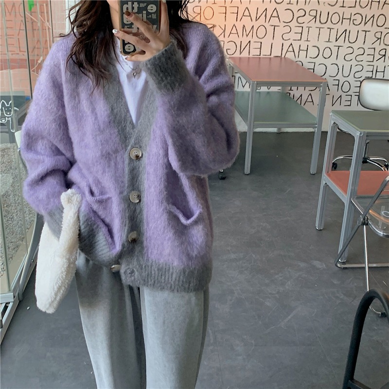 全2色 ニット セーター 長袖 切り替え バイカラー 配色 体型カバー カットソー カレッジ風 通学 原宿系ファッション 韓国風 ダンス衣装 カワ 個性 奇抜 かわいい 青文字系 トップス レ