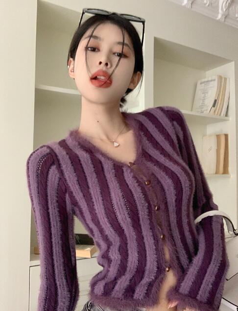 ストライプレディース トップス ニット セーター カシュクール ショート丈 短め丈 長袖 セクシー着回し きれいめ カジュアルふわふわもこもこ 大人可愛い 秋物 秋新作