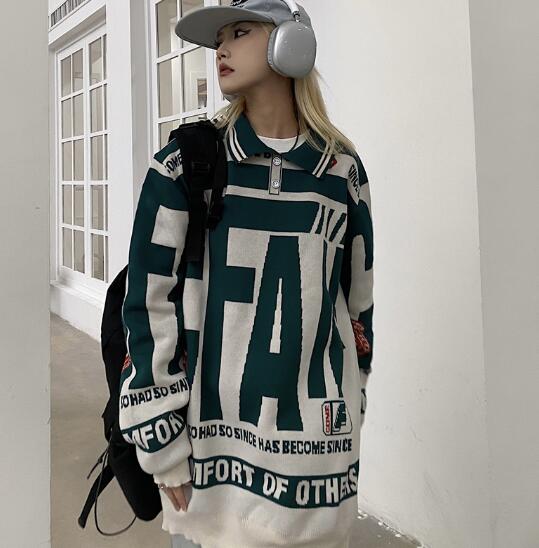 ニット セータートップス長袖 ロゴ総柄襟レディースメンズガールズダンス衣装ヒップホップ大きいゆったり暖かいおしゃれ韓国ファッション服ストリート原宿大人ヴィンテージ風