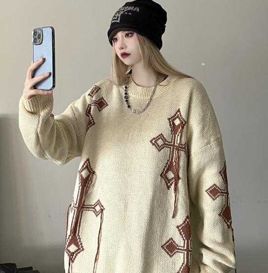 ニット セータートップス長袖 十字架レディースメンズガールズダンス衣装ヒップホップ大きいゆったり暖かいおしゃれ韓国ファッション服ストリート原宿大人ヴィンテージ風