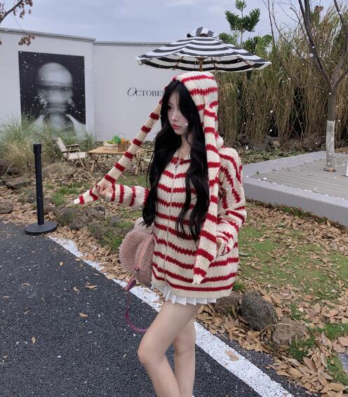 うさ耳付きフードパーカーニットトップス長袖ボーダートレーナーフーディー可愛いレッドダンス衣装ヒップホップレディースガールズストリート韓国