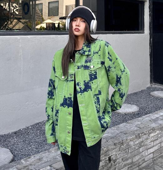 ♪M-展開♪マーブルダイダイジージャンデニムジャケット長袖ジャンシンプルボタンポケットビッグ大きいサイズダンス衣装ヒップホップレディースメンズガールズ大人ストリートアウタージャンパー