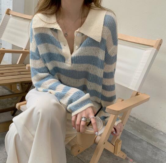 2カラーニット 襟トップス長袖大きい大きめビッグカットソーボーダーブラックホワイトブルーレディースガールズおしゃれかわいいダンス衣装ヒップホップ韓国シンプル
