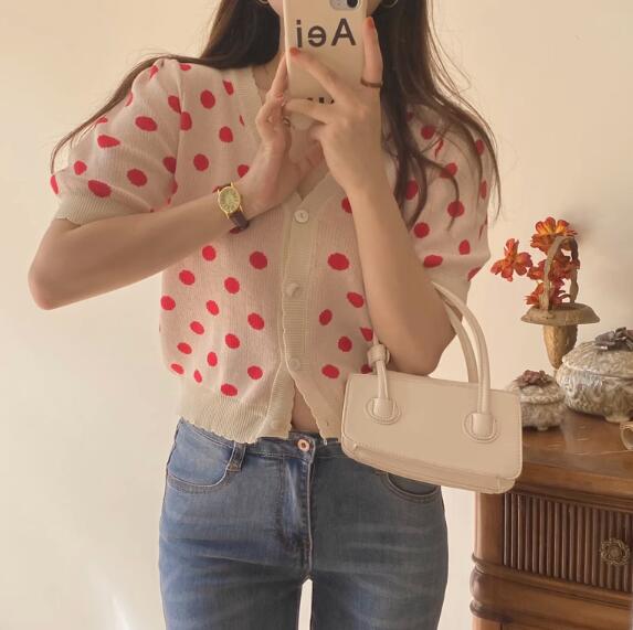 3色レッド赤ピンクブルーニットドット半袖五分袖vネックトップスカットソー レディースガールズストリート服奇抜個性的大人韓国かわいい