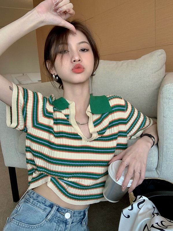 ニット セーター ショート丈 薄手 バイカラー 配色 体型カバー カットソー ボーダー柄 ストライプ柄 ライン ヴィンテージ風 レトロ調 原宿系ファッション 韓国風 ダンス 衣装 ダンサー ヒップホッ