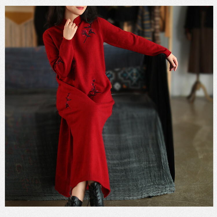 ニットワンピース ロング 秋 冬 おしゃれ レディース レトロワンピース 赤 スリット チャイナ風 チャイナワンピース 刺繍ワンピース 花柄 刺繍 チャイナボタン レトロ エスニック 長袖 きれいめ