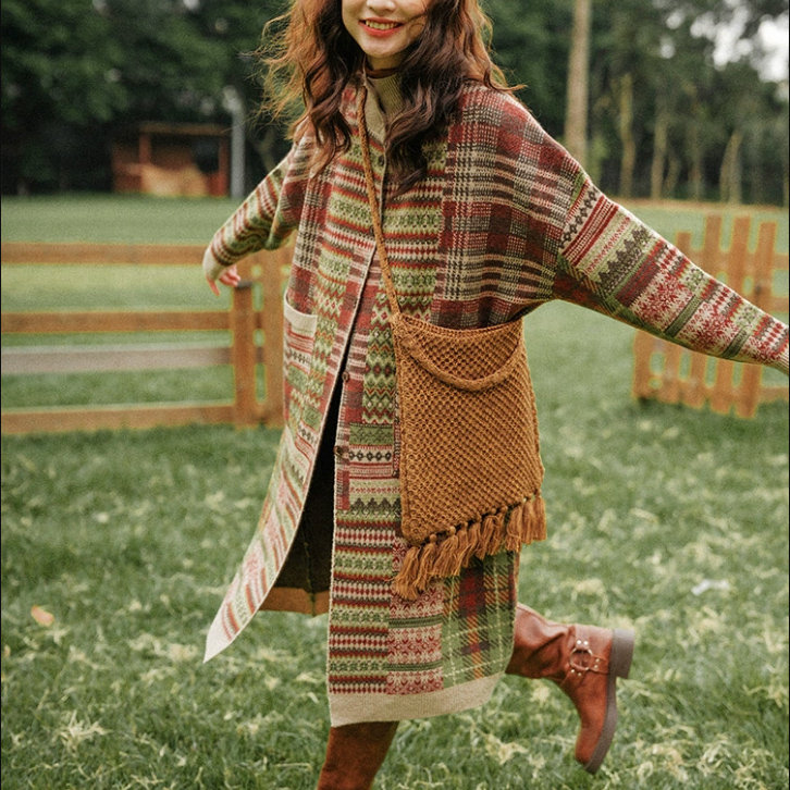 秋冬 レディース ロング丈 カーディガン アーガイル チェック 長袖 ニット 大人 流行 インナー フリーサイズ