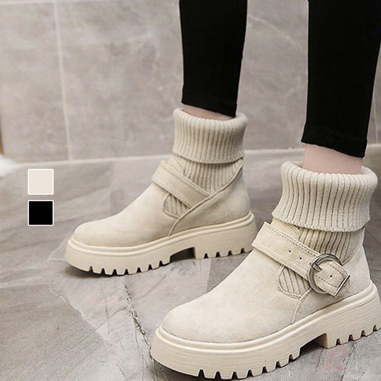 ソックス風 ショートブーツ レディース 2ニットブーツ バックルベルト 厚底ブーツ 歩きやすい ハイカット ブーツ おしゃれ おしゃれ お出かけ 通勤 通学