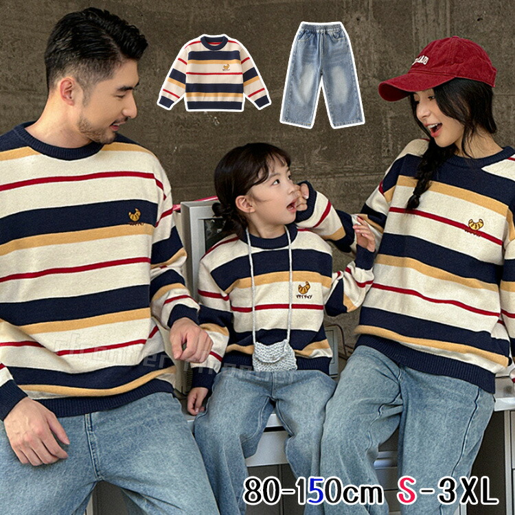 家族揃い キッズ 親子服 カップル デニム パンツ カジュアル 家族 お揃い服 記念日 写真撮影 旅行 プレゼント ニット セーター 黒白 ギフト